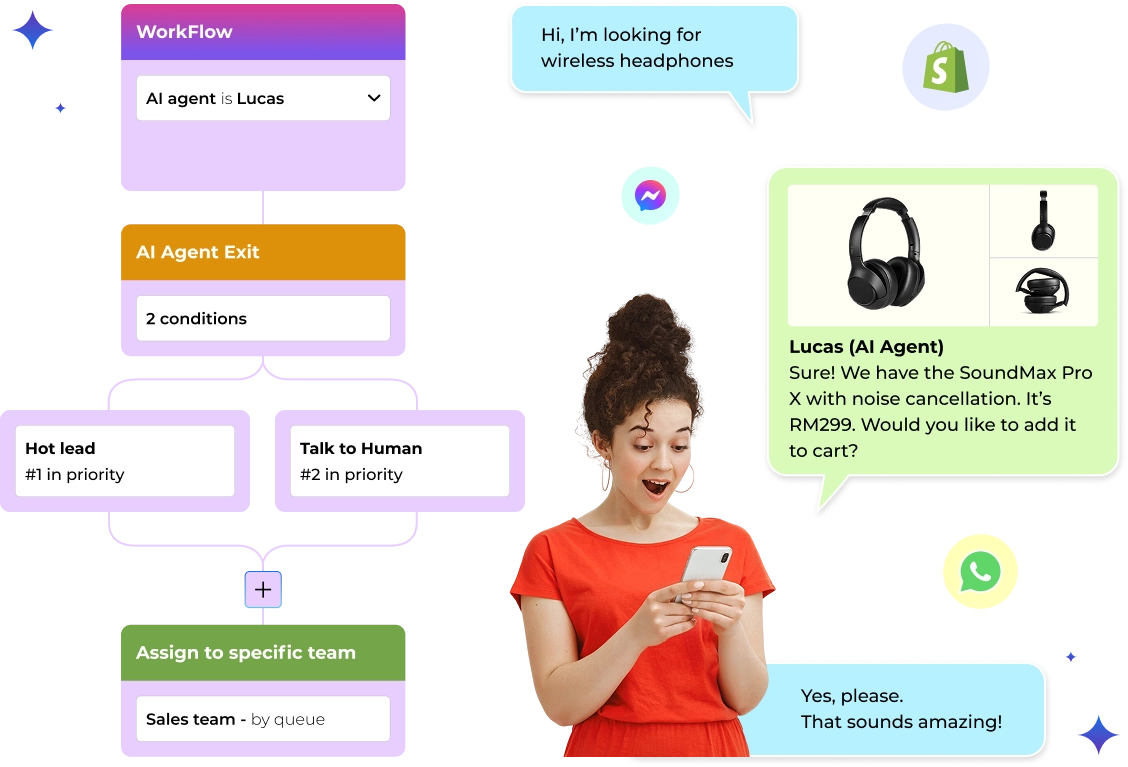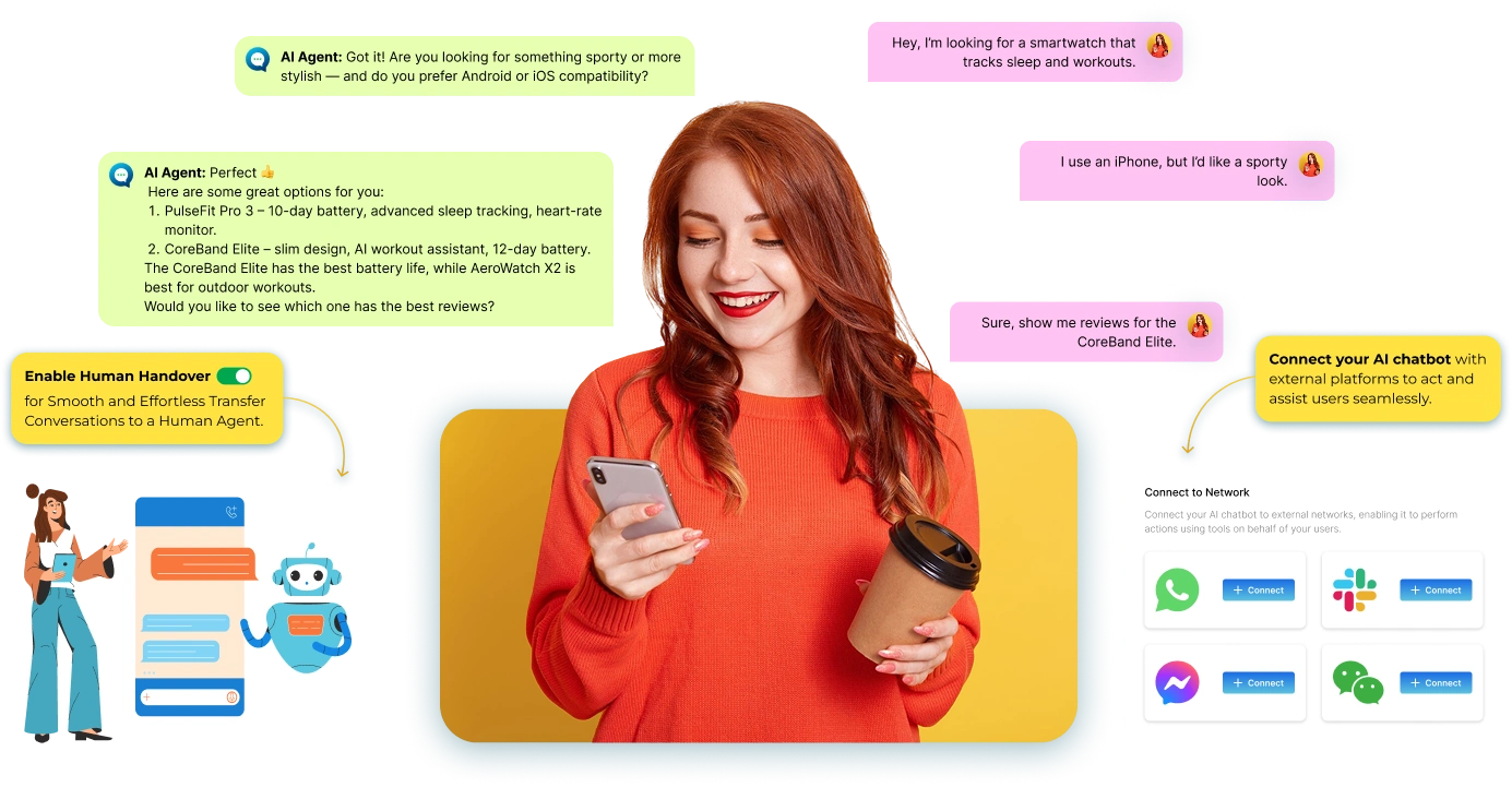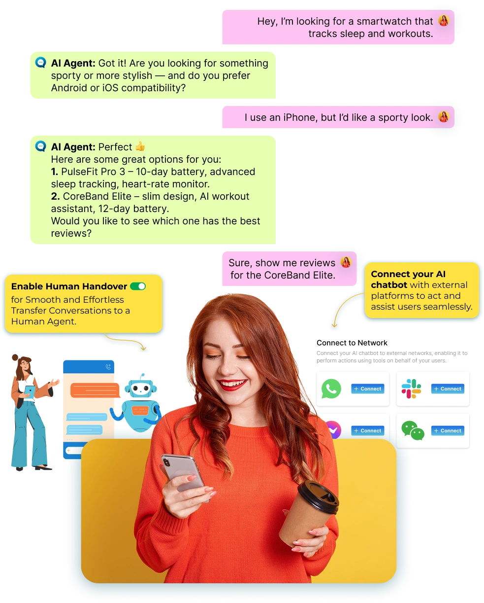 Let the AI take the heavy lifting off your team to deliver fast, human-like support 24/7, answering questions, engaging customers, & boosting growth.